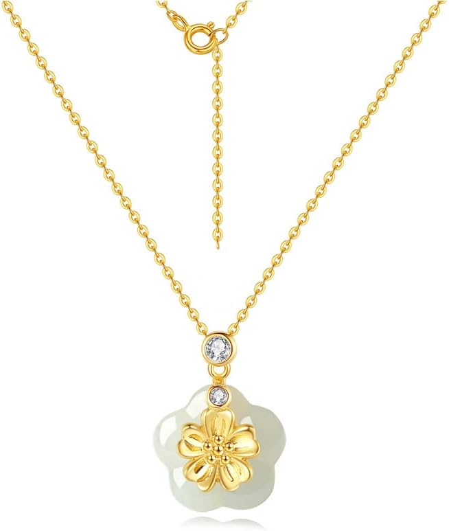 14K Gold Peach Blossom Necklace with Jade and Moissanite Pendant offers an ideal Birthday or Valentine’s Day Gift for Wife or Girlfriend.