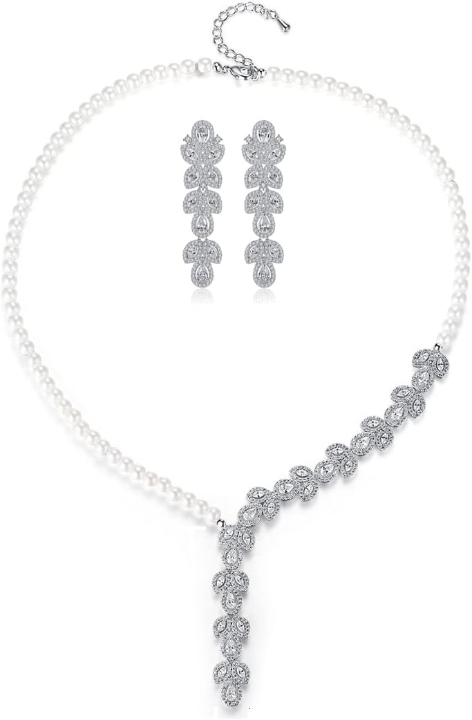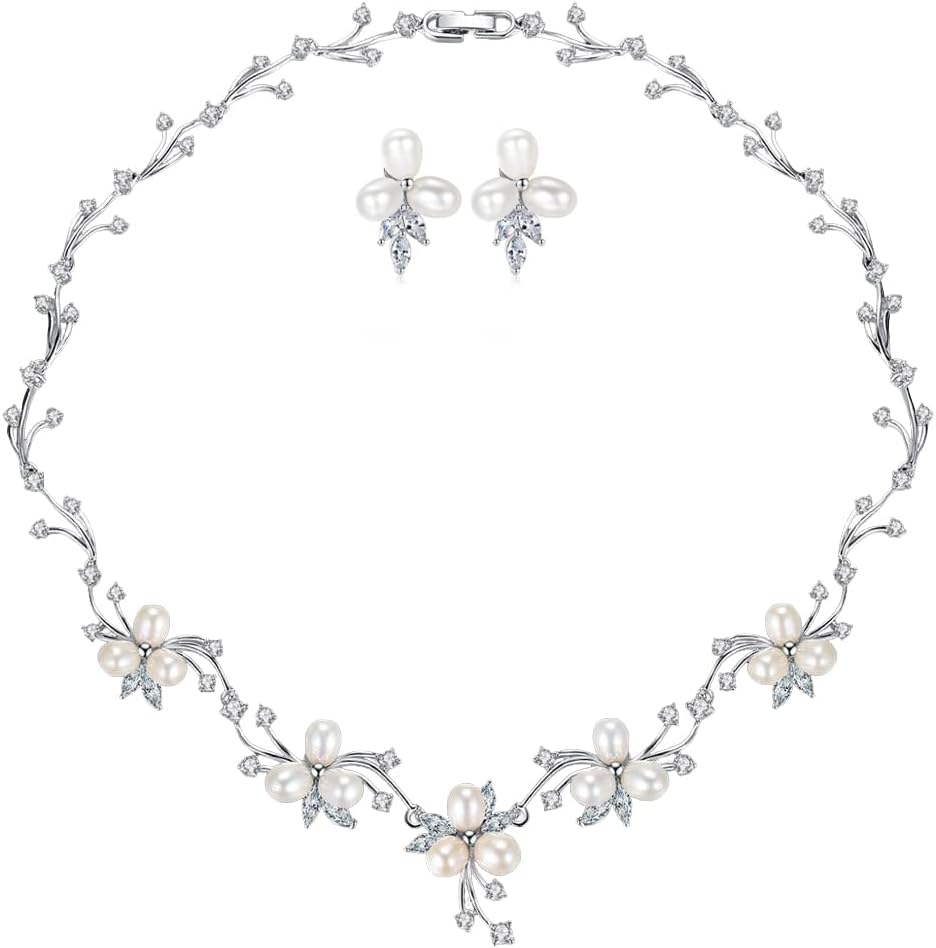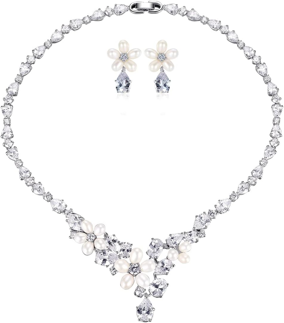 14K Gold & Freshwater Pearl Jewelry Set, Natural Crystal Necklace & Pearl Dangle Earrings, Luxury Bridal/Wedding Fashion Accessory