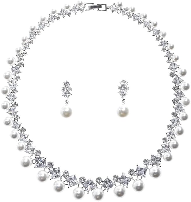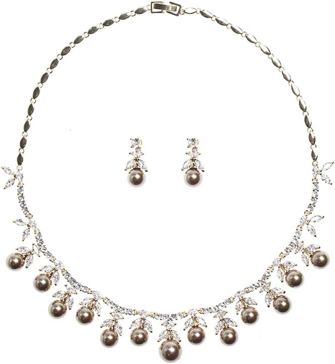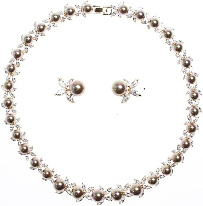 Women’s Bridal Jewelry Set, Gold Freshwater Pearl & Crystal, Choker Necklace & Drop Earrings, Elegant Wedding Fashion Ensemble