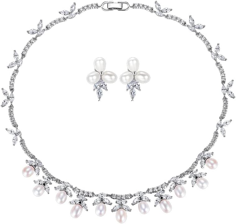 Women’s 14K Gold, Pearl & Crystal Jewelry Set, Freshwater & Natural Choker Necklace & Earrings, Wedding Fashion Ensemble