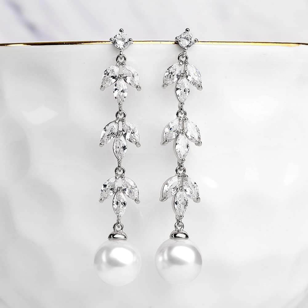 Home Earrings 14K Gold Natural Crystal Pearl Dangle Earrings for Women, Simple Leaf Long Dangle Earrings, Fashion Christmas Jewelry Gift