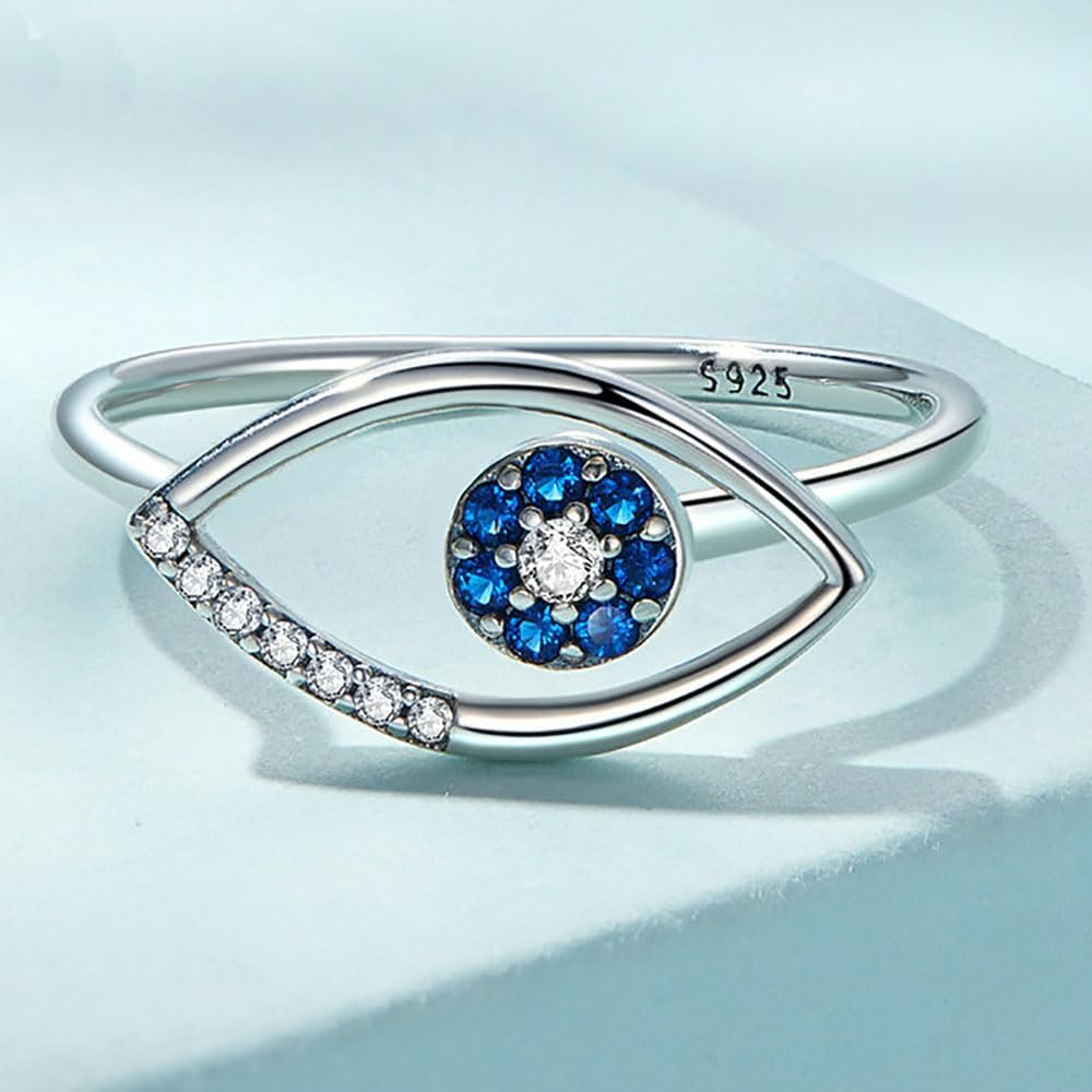 Gold Over 925 Sterling Silver Adjustable Evil Eye Ring with Sapphire and Moissanite, Sterling Silver Protection Band, Jewelry for Women