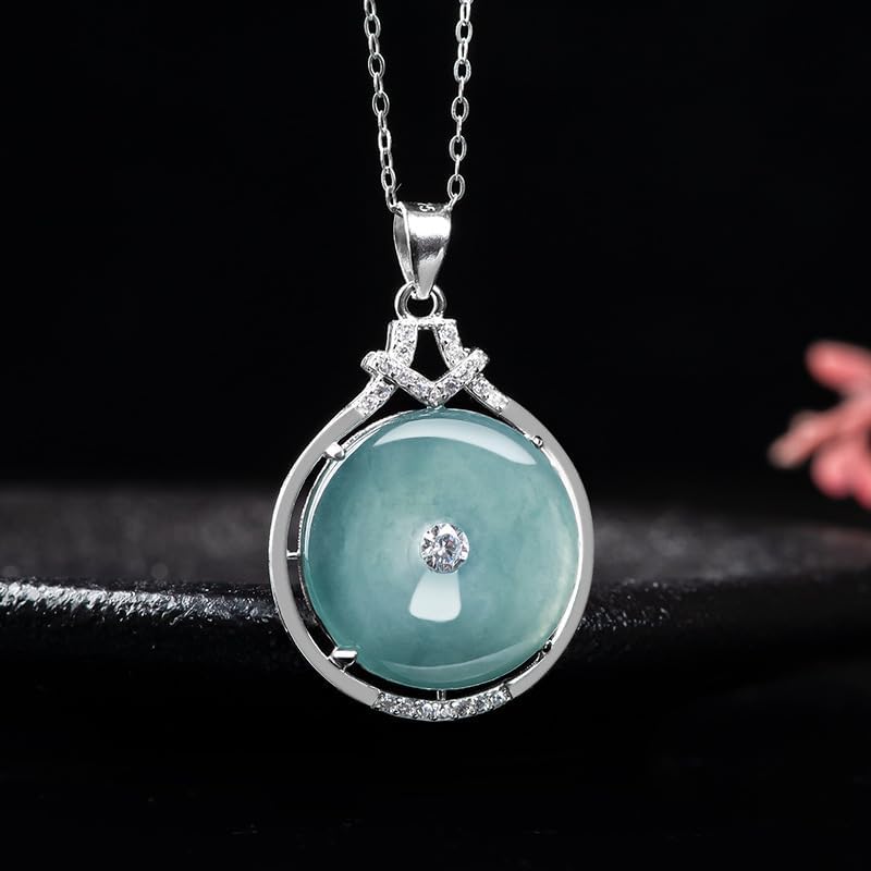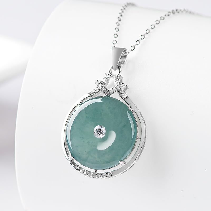 【Designer Words】Our Exquisite Natural Blue Water Jade Necklace is a beacon of safety and elegance. With a peaceful jade buckle and sparkling diamond inlay pendant, this necklace is more than a piece of jewelry; it’s a symbol of care. A treasured gift for any occasion, it echoes with timeless sophistication and grace.