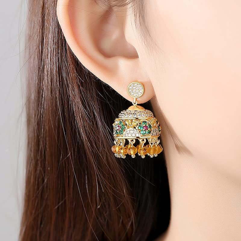 【Vintage Design】This long chandelier earrings are made of natural crystal. The yellow crystal tassel design at the bottom is very eye-catching, like a wind chime, with a hollow in the middle and a row of moissanite as embellishment. Exaggerated design without losing its charm.