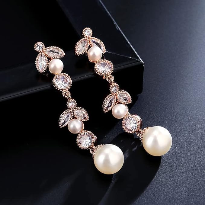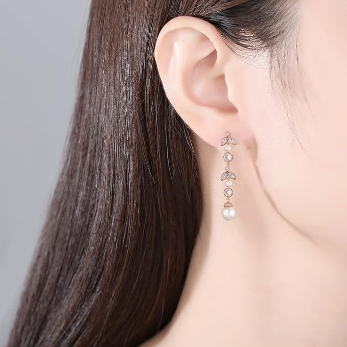 【Distinctive Craftsmanship】Experience the allure of a handcrafted earring design, boasting a unique leaf-shaped setting enriched with moissanite and shimmering crystals. The graduated freshwater pearls elegantly dangle, elevating its charm, making it apt for diverse events.