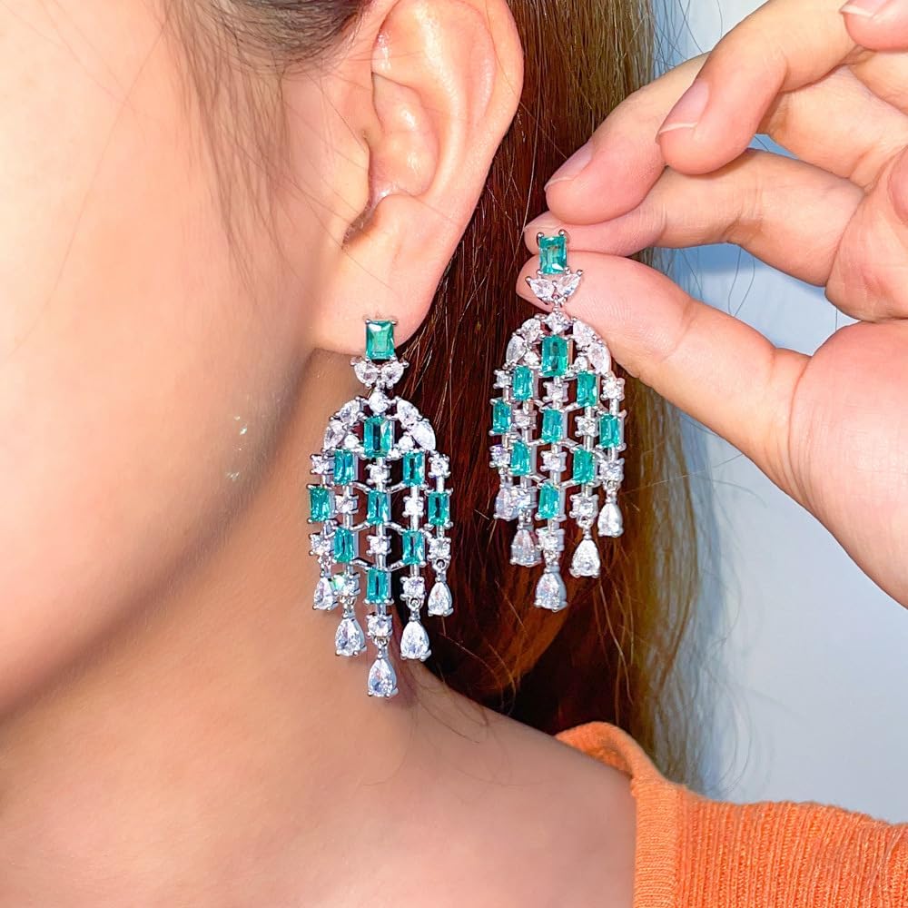 【Chic Tassel Elegance】Elevate your style with these chandelier earrings, brilliantly blending blue square natural crystals with moissanite in an audacious yet enchanting design, ideal for grand banquets and significant gatherings.