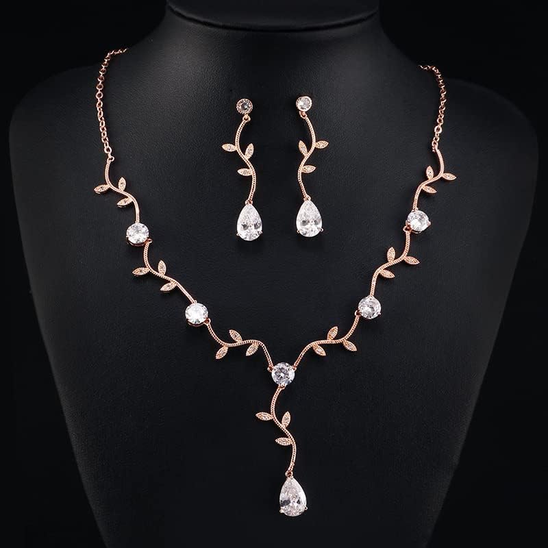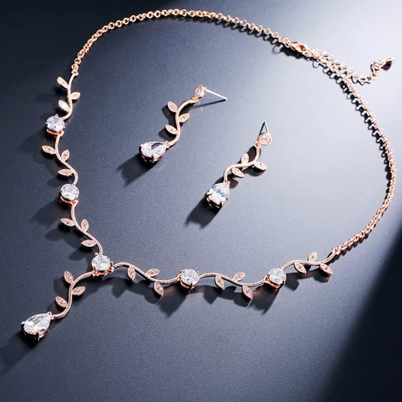 14K Gold Women’s Jewelry Set, Natural Crystal Necklace & Earrings, Luxurious Bridal/Wedding Fashion Accessory