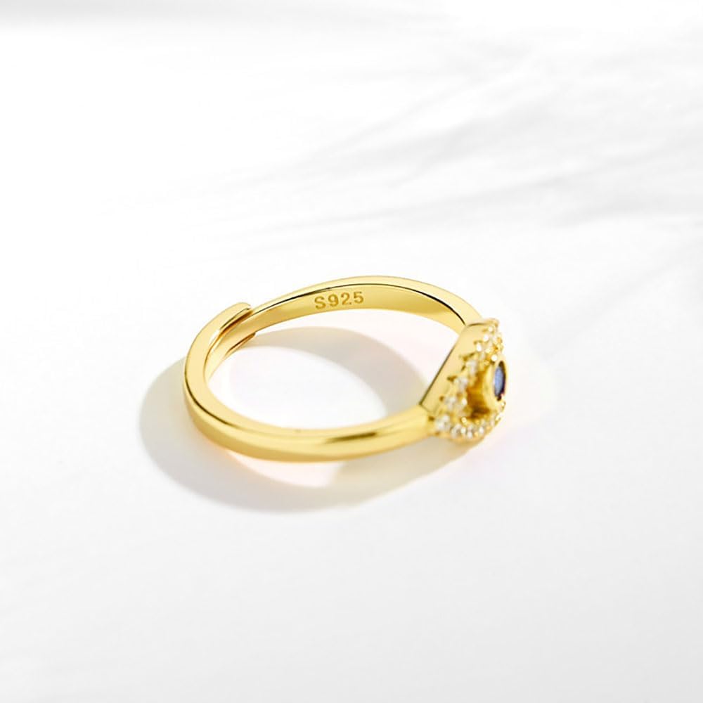Gold Over S925 Sterling Silver Evil Eye Adjustable Ring, Dainty Devil’s Eye Rings Embellished with Moissanite and Sapphire, Fashionable Lucky Jewelry for Women