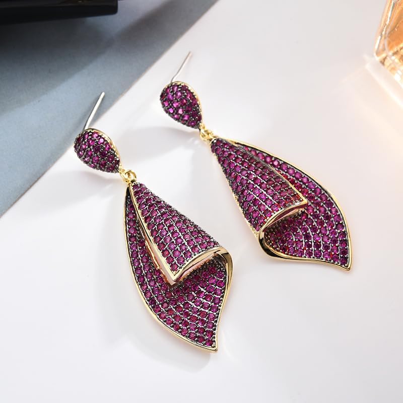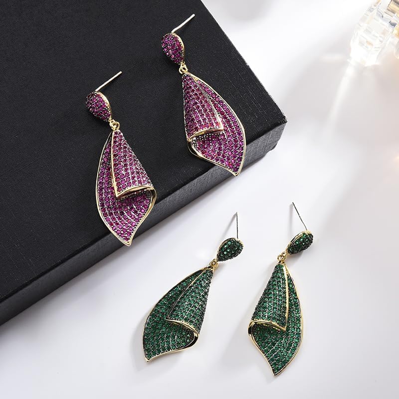 Gold Spiral Design Crystal Drop Earrings for Women,Dainty Petal Shape Pave Crystal Long Dangle Earrings,Luxury Jewelry Gift for Her