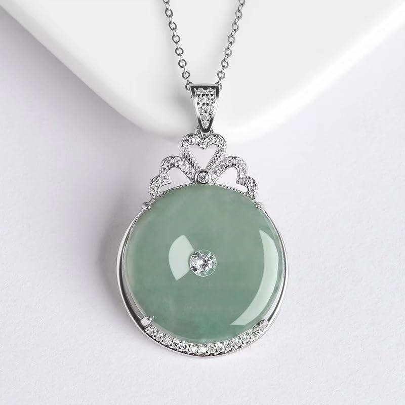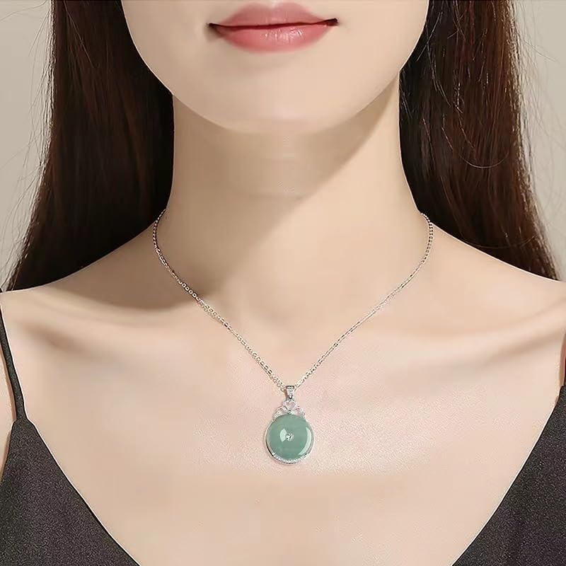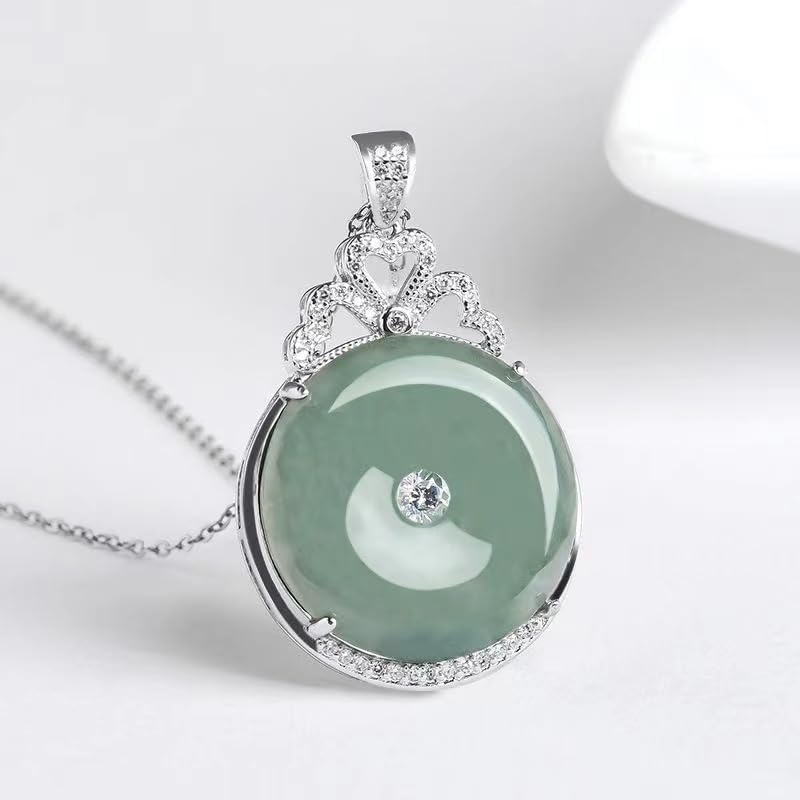 【Designer Words】Unveiling our Timeless Natural Green Jade Necklace, a masterpiece of elegance and symbolism. The fashionable diamond inlaid peace buckle pendant is more than a piece of jewelry; it’s a symbol of harmony and protection. This unique and treasured gift is a perfect expression of care and love, adding a touch of charm to any outfit.